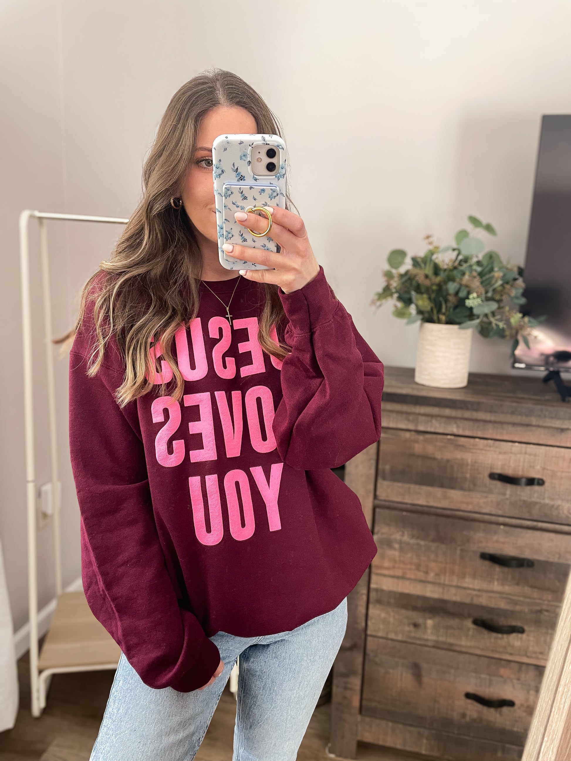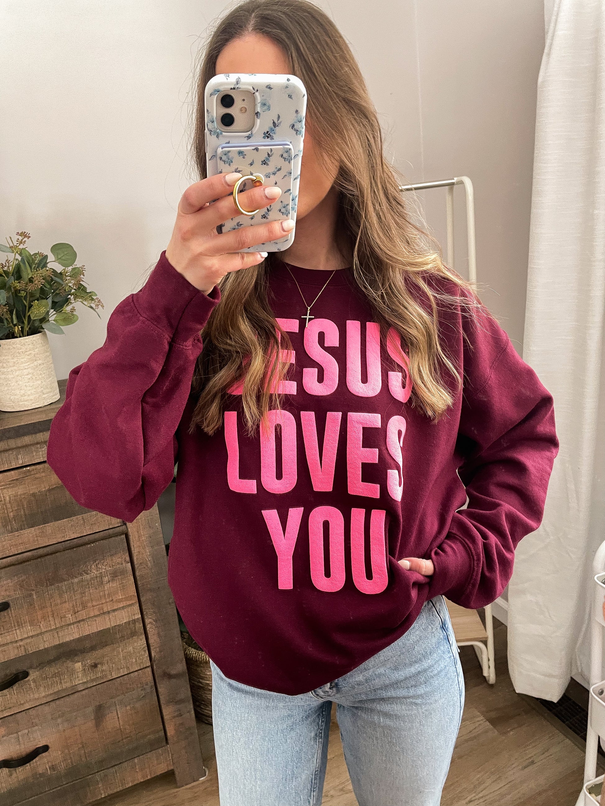 Our "Jesus Loves You" crew is a beautiful reminder to yourself and others that you are deeply loved by Jesus. Wear this cozy crew and spread this truth wherever you go.